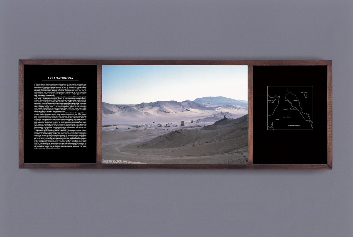 The Book of Lost Cities (1996) consists of ten backlit transparencies housed in wooden boxes reminiscent of museum display cases, each accompanied by an original text and a schematic map. The work plays upon the ambiguous nature of the photographic image, upon the powerful authority of scholarly texts and upon the fluctuating interpretation of historical and archaeological evidence. It is also a commentary on the way landscape is shaped and interpreted by history. Finally, like history itself, it is a labyrinth weaving truth and fiction into an inextricable whole.